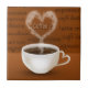 Une illustration de la Coupe du café avec une tasse blanche de café chaud avec de la fumée en forme de coeur sur un arrière - plan marron avec typographie au mur.