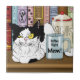 Un chat en tuxedo noir et blanc se réveille sur un plateau de cuisine avec ses livres de cuisine, tasse à café, sucre et crème.