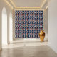 Cette mosaïque est composée d'un motif d'inspiration symétrique, florale, avec une palette de couleurs de bleus profonds, rouges, oranges et blanc cassé. Le motif central est une forme de losange avec une fleur stylisée à l'intérieur, entourée d'éléments courbes et pétales. La plus grande motif est composée de formes florales et foliaires répétées, créant un design cohésif et décoratif. L'arrière - plan a une texture subtile de grain de bois, ajoutant profondeur et intérêt visuel.