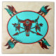 Éclairez votre maison avec ce crâne Buffalo unique "One of a Kind" et flèches Carreaux en céramique! Il comprend un crâne et des flèches amérindiennes avec des plumes sur un Arrière - plan Turquoise...Entouré d'une frontière sud-ouest en Flames Turquoise, Orange et Noire! C'est un "One of a Kind" Art Design original par l'artiste Kerry Miller.