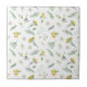 Une tuile d'art transparente et transparente pour créer une surface continue pour le carrelage, ou simplement pour des utilisations individuelles. Le design est composé de fils jaunes, de marguerites blanches et de morceaux botaniques assortis, en petits caractères.