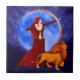 La sorcière gitane aux cheveux rouges est debout avec son lion magique alors qu'elle utilise la lune du croissant pour tirer des étoiles dans le ciel pétillant.