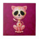 Cette conception rose adorable de chaton est décorée des remous et des motifs de point sensibles. La fleur jaune pédale cercle les yeux au beurre noir purs dans la tradition du jour des crânes morts de sucre. Le chat s'assied, regardant en avant avec sa queue ondulant à l'arrière-plan. La tête surdimensionnée se repose sur un corps minuscule qui crée un espiègle, bande dessinée comme l'aspect. Une étoile de cinq points se repose au milieu du front du chaton tandis qu'un coeur rouge et jaune lumineux apparaît au centre du coffre. Une ombre tombe sur l'arrière - plan rose vibrant faisant la conception semblent flotter juste au-dessus de la surface de cette tuile. Le petit chat mignon est un amusement et une conception élégante inspirés par les beaux motifs du jour des crânes morts de sucre.