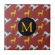 Carreaux céramiques personnalisables avec chiens bleu et jaune motif sur arrière - plan rouge foncé + marque ronde noire pour Monogram. Vous pouvez facilement modifier le monogramme (police, couleur, taille et position) en cliquant sur le bouton personnaliser. Parfait pour le Nouvel An Chinois du Chien 2018 ou anniversaire (personnes nées dans l'année du Chien).