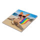 Cette jolie photo montre un chihuahua chien sur la plage portant un drapeau Gay pride couleur arc-en-ciel.