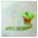 Photo d'une grande pomme verte contre un arrière - plan rouge. La pomme est mangée, seul le noyau est laissé. Text Apple à l'intérieur est ajouté. Cela signifie que la pomme est à l'intérieur du mangeur.