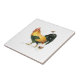Il est coloré dans les or, des oranges et des verts. Il y a un vol de papillon de monarque au-dessus de lui, et la séance tranquillement à l'arrière-plan est une petite poule brune avec trois petits poulets jaunes.