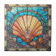 Ce carrelage en céramique présente l'image d'un coquillage orange tan contre l'eau bleue de l'océan. Les couleurs utilisées sont le bleu, l'or, l'orange, le marron et le bronzage. Un effet de recouvrement de vitraux donne un intérêt supplémentaire au design. Beau pour n'importe quelle maison, mais surtout pour une maison de plage ou pour quiconque aime la mer.