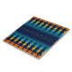 Inspirée par les magnifiques ciels de coucher de soleil et les pins Ponderosa d'Arizona, cette œuvre d'art originale présente un ciel de coucher de soleil orange, jaune et bleu lumineux derrière des arbres ponderosa géométriques et des étoiles dans un motif de style couverture de selle.
