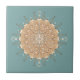 Cette jolie tuile comporte un mandala dans une gamme de couleurs d'ecru et de pêche à brun clair sur un fond clair de turquoise, avec des motifs de nature.