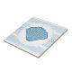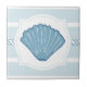 Ce carreau de céramique a un thème nautique avec les rayures volumineuses bleues molles à l'arrière-plan avec une conception de corde au milieu. Centré est un cadre blanc avec un coquillage bleu-clair de feston. Quelques éléments de conception sont marché de graphique de copyright