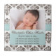 Ce carreau de céramique fait sur commande de damassé bleue et brune de coquille d'oeuf douce et élégante fait un beau nouveau cadeau de photo de bébé, un faire-part de bébé ou un baptême unique ou un cadeau de baptême. Cette tuile personnalisable peut être personnalisée avec le nom du bébé et toute autre chose que vous voudriez dire sous lui. Cette jolie tuile peut être encadrée ou ajoutée à une boîte de souvenir. Conçu par Chrissy H. Studios, LLC.