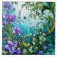 Un design vibrant avec des fleurs violettes entrelacées de verdure luxuriante contre un arrière - plan bleu mélangé, présentant des motifs floraux vifs et des éléments naturels.