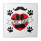 Un chien empreinte de patte dans un coeur rouge avec du texte sur un ruban. Carreaux céramiques carrés personnalisés. Une idée cadeau unique.