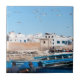 Bateaux de pêche bleu et mouette devant les remparts d'Essaouira - Maroc. Jusqu'aux années 1960, Essaouira était généralement connue par son nom portugais, Mogador.