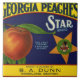 Affichez un morceau d'art vintage sur un carrelage décoratif. Ce carrelage est orné d'un étiquette de caisses de fruits de la marque Star Georgia Peaches avec une grande image de pêche sur l'arbre et d'une étoile d'or avec le logo Georgia Peach Growers Exchange de la tête indienne sur un cercle vert ; le tout devant un arrière - plan bleu foncé. Utilisez ce carrelage comme un trivet ou une décoration dans votre maison ou cuisine. Ajouter un cadre en bois pour améliorer le design et lui donner une surface plus grande pour une poêle chaude ou utiliser pour accrocher le carrelage au mur. Le design a été agrandi pour remplir toute la zone d'impression pour styliser le design étiquette. Si vous souhaitez voir l'ensemble du étiquette, cliquez sur "Customiser!" et utilisez les contrôles pour dimensionner l'art à votre convenance. Une petite histoire du Étiquette Fruit Crate. De 1880 à 1940 environ, l'ouest des États-Unis a connu le début de près de soixante-quinze années de compétition intense entre les producteurs de fruits pour créer les étiquettes de caisses de papier les plus colorés, artistiques et attrayants utilisés pour identifier leurs caisses d'agrumes. Les immigrés allemands ont combiné leurs compétences en imprimerie et en illustration pour créer des créations d'art commercial inégalées dans le monde entier. Depuis des décennies, les Allemands utilisent la lithographie pour créer des étiquettes pour les bouteilles de vin. Les producteurs d'oranges et les expéditeurs de Californie ont adapté le concept de étiquette du vin à un format plus large et des étiquettes de caisses de fruits sont nés. À l'origine, le procédé utilisé pour créer les étiquettes était et est connu sous le nom de lithographie en pierre, où l'illustration était gravée directement sur un morceau de calcaire; un processus exigeant un grand talent et une grande compétence. Les étiquettes de caisses de fruits des années 1880 jusqu'aux années 1920 ont été principalement produits par ce processus lithographique en pierre. Des techniques d'impression plus modernes ont été utilisées après cette période jusqu'aux années 1940 et 1950, lorsque les caisses et les étiquettes en bois ont été remplacés pour la plupart par des boîtes préimprimées en carton. Aujourd'hui, les étiquettes de caissons de fruits sont hautement collectibles et reconnus comme un exemple exceptionnel d'art commercial et d'illustration d'une époque révolue.