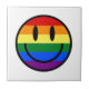 Cette oeuvre colorée présente un visage souriant arc-en-ciel.
