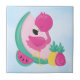 Un carreau en céramique avec une jolie illustration d'un flamant rose avec quelques pastèques et ananas. Couleurs rose et vert. L'été et tropical. L'arrière - plan est une aquarelle bleu clair.
