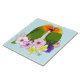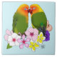 Deux inséparables ensemble sur une branche d'arbre avec des fleurs roses, blanches, jaunes et violettes sur fond de bleu
