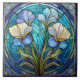 Carrelage en céramique aux motifs floraux d'inspiration Art Nouveau imitant les vitraux. Il montre des iris dans les tons jaune pâle et bleu sur un arrière - plan turquoise et bleu. Parfait pour un décor rétro élégant. Il s'agit du carrelage à gauche, qui peut être jumelé au carrelage à droite pour un décor symétrique.