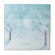 Carrelage en céramique avec aquarelle paysage hivernal raffiné dans les tons bleus. Au centre se trouvent deux arbres recouverts de brume de givre enneigé, les branches des arbres créent une fine toile contre le ciel et s'étirent vers l'autre dans le charme de l'hiver créant une idylle pour de nombreuses années à venir. Tuile de céramique tendre et fraîche d'hiver. Collection de fraîcheur hivernale.