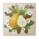 Poires entières et divisées en deux avec fleurs blanches et feuilles verts.