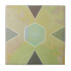 A ceramic tile featuring an earthy palette of soft greens, yellows, and beige with a marbled texture. The design incorporates geometric shapes, including a central hexagon and surrounding triangles outlined in white. This modern yet natural composition brings a serene and balanced aesthetic to any space.