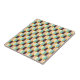 Geometric pattern with overlapping half-circles in teal, cream, brown, and peach on an orange background, creating a vibrant and retro feel.