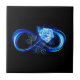 Luminous infinity symbol with glowing, beautiful, lushly blooming rose made of blue flames on black background.