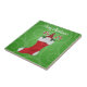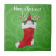 Ce carrelage décoratif en céramique est vert avec un motif tourbillon et un gnome avec une barbe blanche et un casquette rouge à l'intérieur d'un bas de Noël rouge et blanc avec des sucres de canne. Customisez le texte Joyeux Noël avec le modèle.