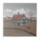 Colourful artwork of an old medieval house in the English countryside, with an old church in the background, and a couple of hares boxing in the foreground. Perfect for anyone who loves folk art.