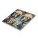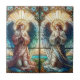 Cette oeuvre, bien qu'elle ressemble à un vitrail, est en fait un carreau en céramique conçu pour imiter la beauté intemporelle de la verrerie traditionnelle. La pièce représente deux anges agenouillés dans la prière, leurs mains délicatement accrochées à la dévotion. L'ange à gauche porte une robe rose et rouge qui coule, complétée par des ailes dans les tons bleu et vert, tandis que l'ange à droite est drapé dans une robe bleue et blanche sereine avec des ailes de couleur similaire. Derrière eux, un motif rayonnant baigne la scène dans une lumière divine et chaude. En contrebas, un paysage pittoresque se déploie, avec une rivière sinueuse qui traverse une végétation luxuriante. Bien qu’il ne s’agisse pas de vitraux authentiques, l’artisanat complexe du carrelage et l’utilisation minutieuse de la couleur créent une illusion étonnante. Le vitrage détaillé et la finition texturée évoquent l'effet lumineux de la lumière passant à travers le verre, permettant à cette oeuvre céramique d'avoir le même attrait spirituel et artistique.