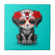 Caractéristiques de conception ce mignonnes qu'un petit chiot noir a décorées du jour des motifs morts. Les roses rouges apparaissent dans les oreilles de chiens tandis qu'une étoile de cinq points se repose au milieu du front. Le visage du chiot noir est blanc peint et est décoré des remous et des motifs de point dans la tradition du jour des crânes morts de sucre. Les os blancs et une cage thoracique apparaît sur le corps de dog'd qui lui donne un regard squelettique. Le corps principal et petit classé fini avec les détails dans la fourrure créent une belle combinaison d'une bande dessinée et d'un regard réaliste. Ce chiot unique et adorable est un jour adorable de la conception morte.