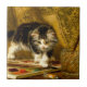 Carrelage en céramique avec la peinture à l’huile de Henriëtte Ronner-Knip The Young Artist (1821-1909). Un chaton noir et blanc joue avec un set de peinture et deux brosses. Un cadeau adorable pour les amoureux de les chats et les amateurs de romantisme.