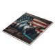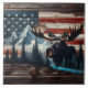 Une tête d'orignal émerge d'un décor rustique en bois avec le drapeau américain, les montagnes et les pins, célébrant la nature et le patriotisme.