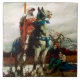 Un chevalier en armure monté sur un cheval se tient à côté d'une rivière, tenant une lance à l'expression réfléchie. A proximité, deux individus s'assoient sur le sol, regardant le chevalier avec des expressions d'inquiétude ou de peur. Cette peinture s'appelle "The Coming Lancaster" de Howard Pyle.