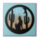 Une belle image du sud-ouest de style comportant un coyote dans le désert, entouré par des cactus, hurlant à la lune dans le ciel de soirée.
