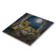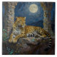 Leopard themed tile. On the front is an illustration of a majestic leopard with fur like molten gold, laying on a cliff ledge bathed in ethereal moonlight. Intricate carvings adorn crumbling stone pillars, and bioluminescent flora casts a soft, otherworldly glow. The scene is rendered in a rich, textural oil painting style with thick strokes.