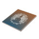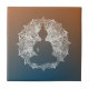 une oeuvre de mandala décorative en cercle, avec de nombreux éléments géométriques abstraits et la silhouette d'un bouddha méditant dans les tons bleu et orange.