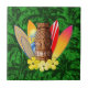 Le masque hawaïen de Tiki avec des certaines rétros planches de surf vintages et ketmie jaune fleurit, la fleur d'état d'Hawaï.
