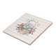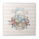 Un carrelage en céramique avec pêche et motif rayé blanc. Illustration numérique à base d'aquarelles. Un charmant lapin lapin portant une robe bleue assis dans un panier entouré de ses oeufs. Des papillons flottent autour de la corbeille décorée d'un bouquet de fleurs soigné.
