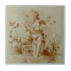 Une charmante tuile de Minton datant de la fin du XIXe siècle, reproduite ici en sépia. (Les autres couleurs sont répertoriées séparément.) Elle présente un putti ou un chéri serpentant les oiseaux avec ses poêles. Disponible en tuiles murales de 4,5 et 6 pouces ainsi que d'autres articles.