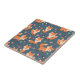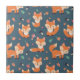 Un carreau en céramique avec un motif fait de renards orange mignons et heureux. Arrière - plan vert foncé. Petits champignons et feuilles saupoudrés.arrière - plans dans des couleurs pastel délicates et muettes.