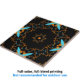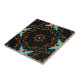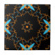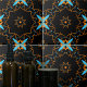 Ce carrelage en céramique présente un motif symétrique à la fois complexe et saisissant visuellement. La couleur arrière - plan est noire, ce qui contraste fortement avec les motifs vibrants qui ornent la surface. Le design est composé de motifs floraux complexes dans des tons vifs d'orange et de bleu, encadrés de délicates lignes dorées. Ces motifs sont disposés symétriquement, créant un équilibre harmonieux qui plaît à l'oeil. Au centre du carrelage se trouve une silhouette en forme d'étoile, entourée de plus grands motifs floraux à chaque coin. De petits points bleus sont éparpillés tout au long de la conception, ajoutant profondeur et complexité au motif général.