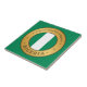 The national flag of Nigeria is encapsulated in a faux gold ring shape. Around the outer of the ring, are two parts of text with the official name of Nigeria and the country name.