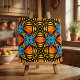 Cette céramique dispose d'un beau motif qui attire l'oeil dans une danse de couleur et de forme. Le design complexe est caractérisé par des arrangements symétriques de teintes vibrantes, créant un effet d'illusion optique. Les formes orangées, qui ressemblent à des yeux ou des feuilles, sont centrales dans le motif, rayonnant un sentiment de chaleur et d'énergie. Elles sont accentuées par des lignes jaunes radieuses qui ajoutent du contraste et mettent en surbrillance la géométrie de la conception. Les tons bleus cool apportent de la profondeur au carrelage, apparaissant comme des fleurs en fleurs ou des étoiles au milieu de la vibration. Ces éléments sont définis par des lignes noires profondes, ajoutant une structure visuelle et améliorant l'effet global.