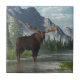 Un orignal de taureau se tient dans les eaux profondes de cheville d'une rivière peu profonde et paresseuse qui enroule sa voie par une vallée boisée. Les sapins et la longue herbe rayent les banques des rivières, alors que les montagnes rocheuses déchiquetées enferment la vallée. L'orignal regarde de retour vous comme si vous l'avez juste interrompu tandis qu'il a une boisson.