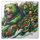 trois ours animés et stylistiques apparaissent dans une scène dynamique et fantaisiste en traversant une voiture verte classique dans un environnement abstrait et coloré. Le plus grand ours, au visage expressif, prend la tête, les autres joyeux se joignent à l'aventure. Les motifs tourbillonnants et les motifs enflammés qui les entourent ajoutent à la nature fantastique de cette oeuvre.