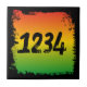 Apportez une touche caribéenne à votre maison avec cette tuile murale colorée de numéros de maison. Il a un cadre noir grunge sur un coucher de soleil rouge, or et vert rasta coloré avec des numéros de maison noirs. Customisez le texte pour créer votre propre panneau de numéro de maison