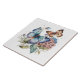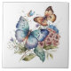 Papillons bleus et bronzés avec fleurs rouges et bleues et verdure.